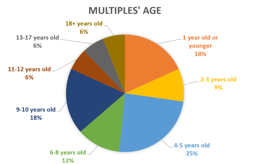 More than Multiples: The more, the merrier! This year, exactly half of our members have other children in addition to their multiples (it was MORE than half previously, if you can believe it!). Of those, slightly more members had older children than younger children, but NONE have both older and younger kids. We also have one family currently who has two sets of multiples, plus another older child.