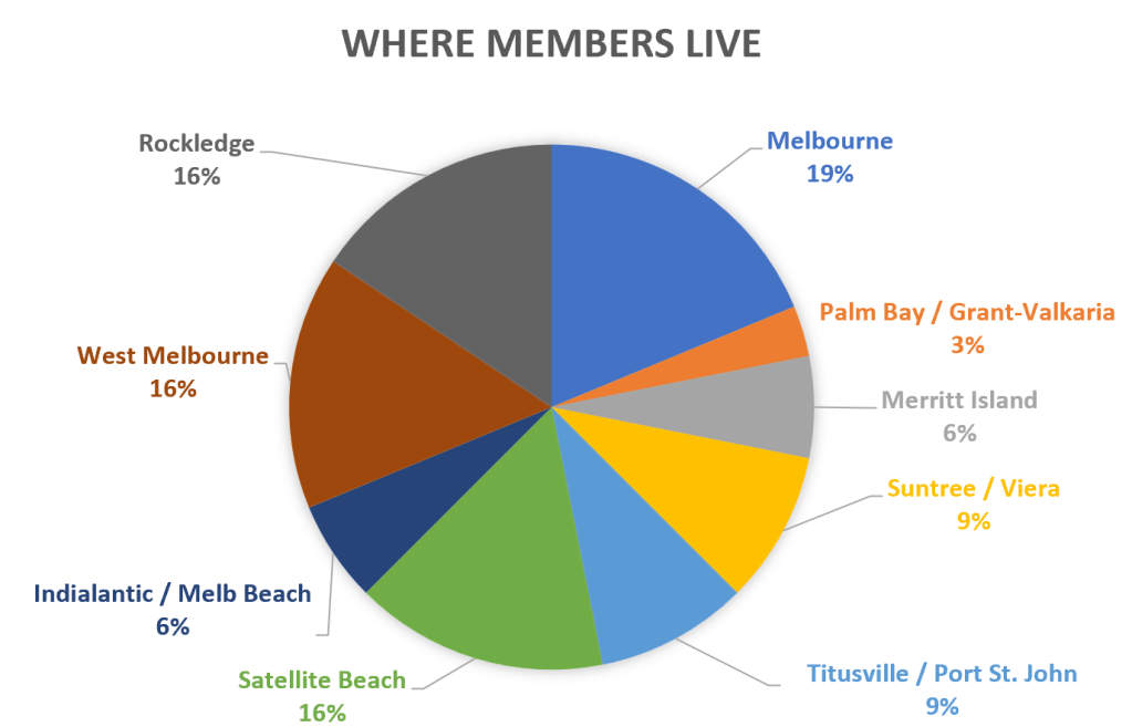 Locations of Members: This is an area that has remained very steady compared to a year ago – a little over a quarter of our members live beachside and about three-quarters live on the mainland, primarily between West Melbourne and Rockledge.
