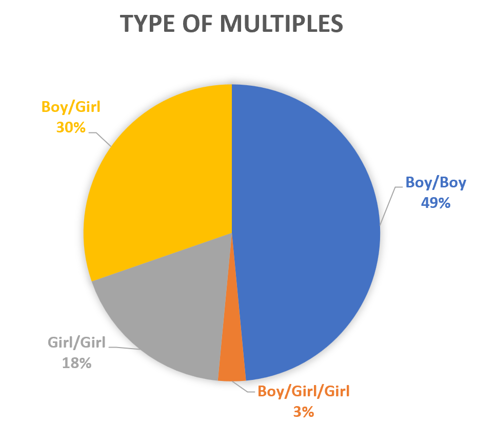 Types of Multiples: This are saw a high shift in the last twelve months! After several years of sex combinations being pretty equal, we were thrown for a loop this year and HALF of our members now have boy/boy twins! Boy/girl is the next most-popular, with just under a third of our members, and then girl/girl. We have one set of triplets at the moment, and have no families at present who have quads or higher.