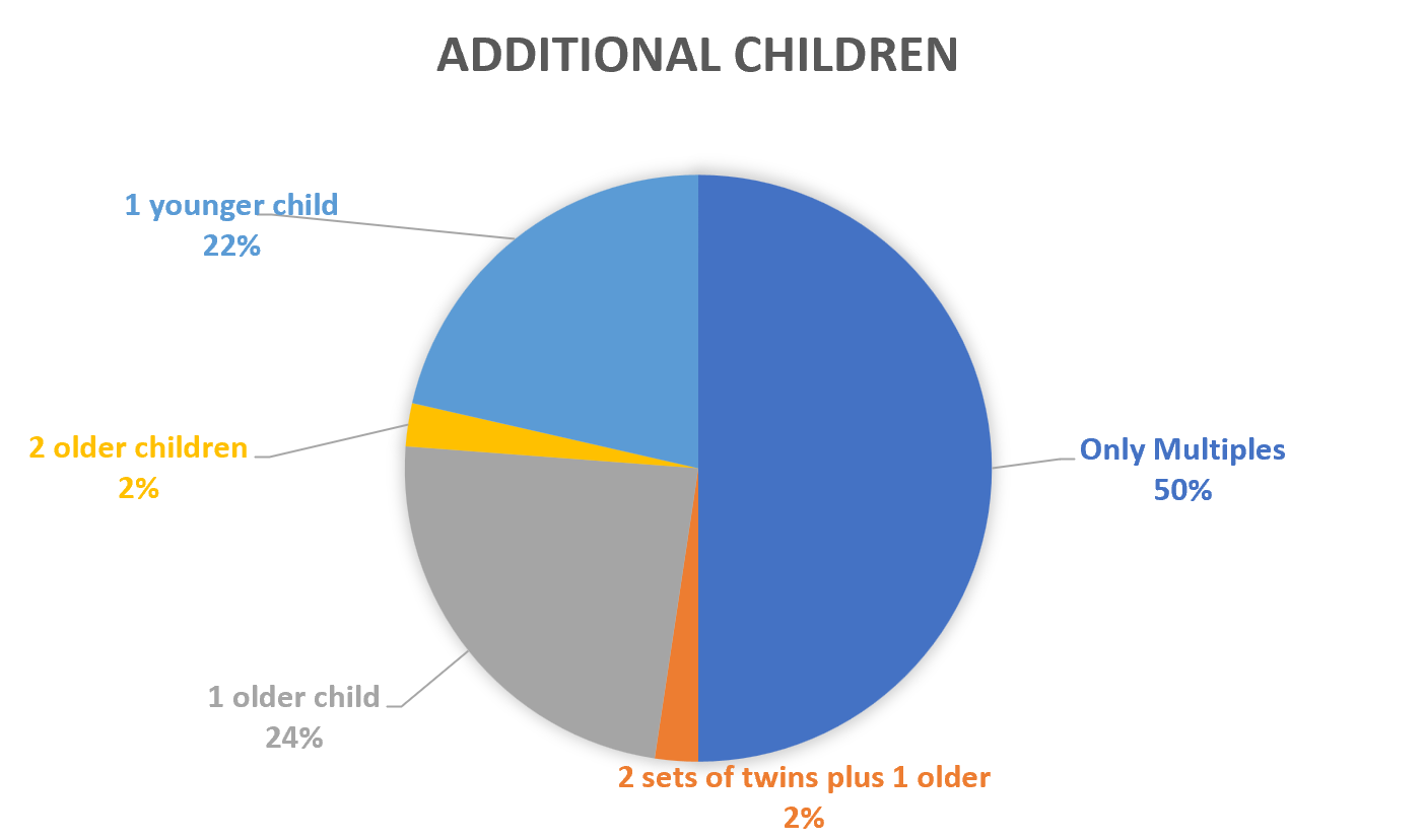More than Multiples: The more, the merrier! This year, exactly half of our members have other children in addition to their multiples (it was MORE than half previously, if you can believe it!). Of those, slightly more members had older children than younger children, but NONE have both older and younger kids. We also have one family currently who has two sets of multiples, plus another older child.
